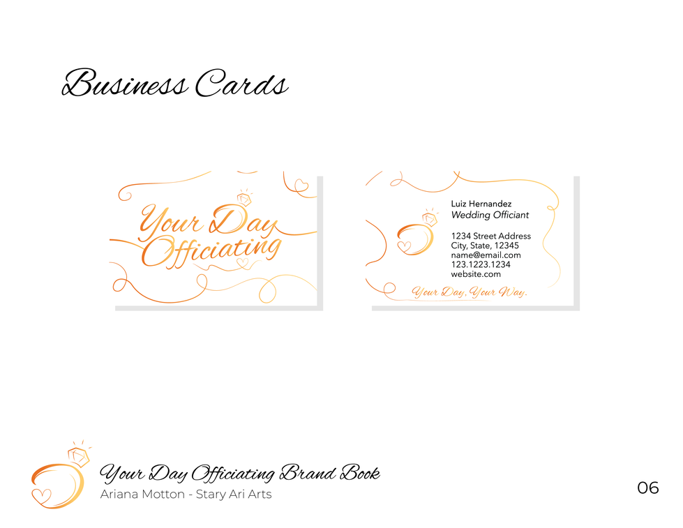 This project involves rebranding 'Your Day Officiating,' a locally owned wedding services business in the heart of Denton, Texas, specializing in officiating, vow renewal, planning, and more. For my Visual Identity and Symbol class, I was tasked with creating a new logo suite, mockups, and a refreshed identity from scratch.